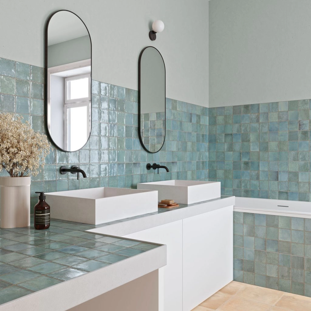 - Efekt wizualny: mozaika z nieregularnych cegiełek / małych kwadratów z widocznymi fugami – styl zellige, marokański, vintage, boho