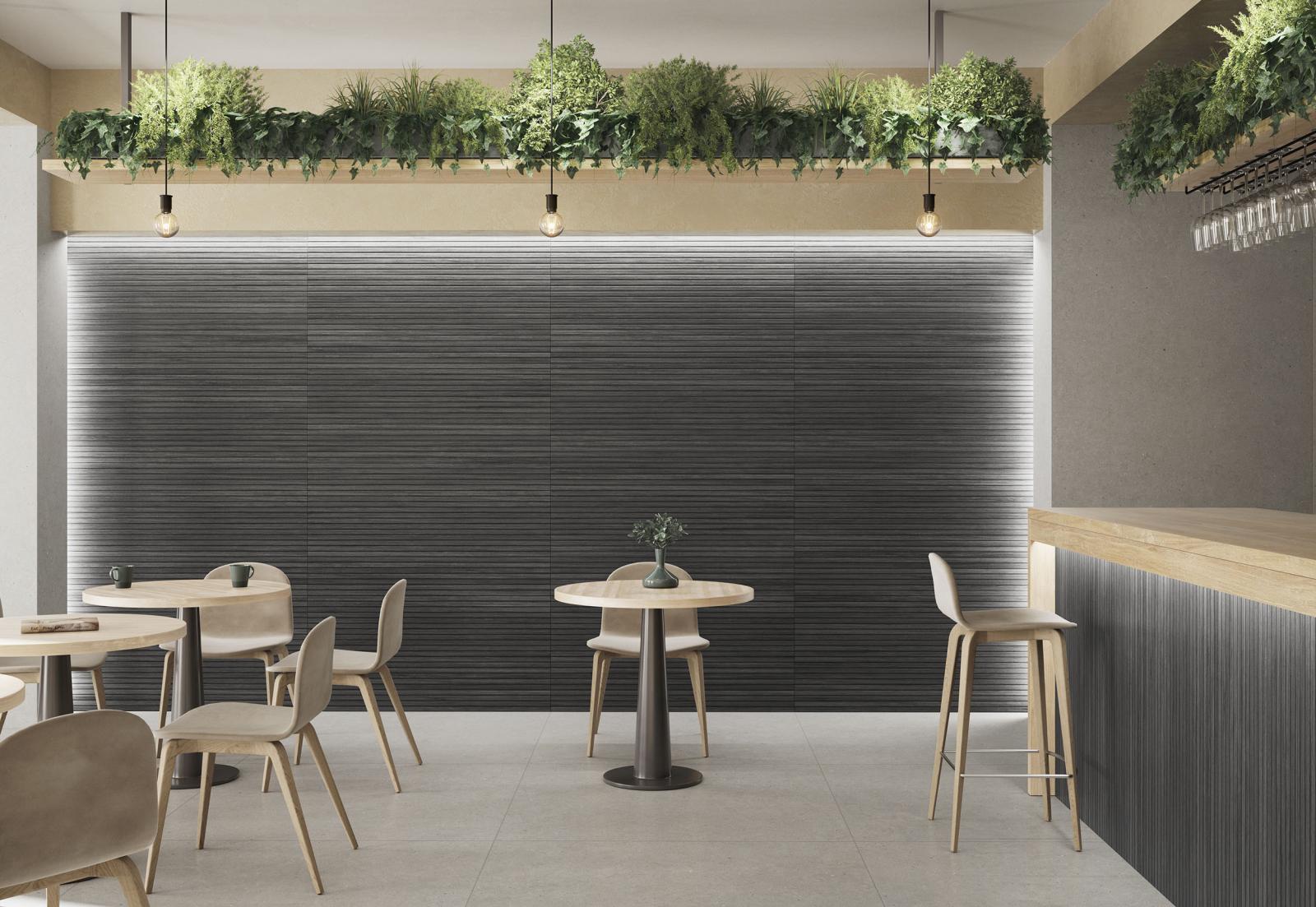 To nie jest płaska czarna płytka – wyraźna, pionowa struktura carving tworzy prawdziwy 3D efekt: żłobienia i przetarcia imitują naturalne drewno lub panele, łapią światło i cienie, zmieniają się w zależności od kąta padania światła. Głęboka czerń jest matowa – nie odbija jak lustro, ale subtelnie połyskuje w pewnych miejscach, co daje wrażenie luksusowej, postarzanej stali lub drewna. Format 60×120 cm + rektyfikowane krawędzie = fuga prawie niewidoczna (1–2 mm), a jedna ściana wygląda jak jedna wielka, monolityczna dekoracja. To lamele bez pyłu, bez kleju, bez konserwacji – czysta elegancja i prostota montażu.