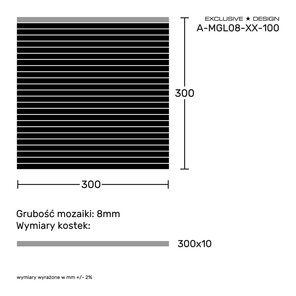 Mozaika w kolorze klasycznym - białym, choć kształt jest dość niecodzienny - długie na 30cm czarne kostki są doskonałe do stworzenia niecodziennych powierzchni dekoracyjnych. Najwyższa jakość wykonania, kostki ręcznie naklejane na siatkę transportową. Gwarantujemy pełne zadowolenie. Mozaika marki EXCLUSIVE DESIGN to wyrób ręcznie wykonany. Każda pojedyncza kostka tej czarnej mozaiki zostaje sprawdzona, po czym umieszczana na siatce transportowej. Dzięki siatce transportowej, sam montaż tafli mozaiki jest o wiele szybszy i łatwiejszy - przec co mniej kosztowny.