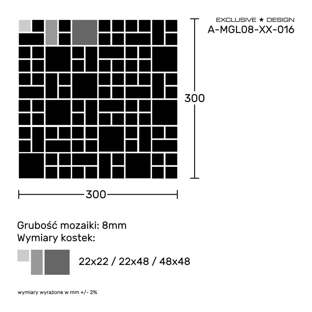 Większość tafli mozaiki szklanej ma wymiary 30x30cm, choć zdażają się wyjatki o nieregularnych kształtach.