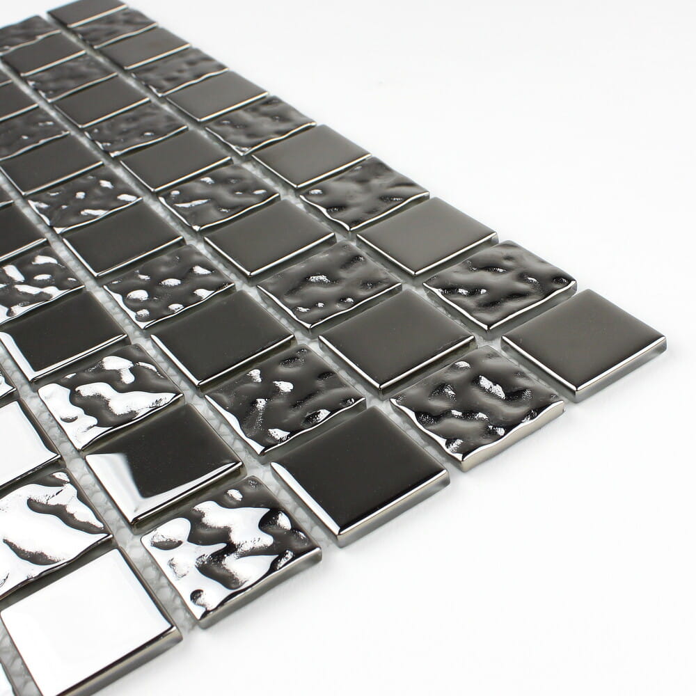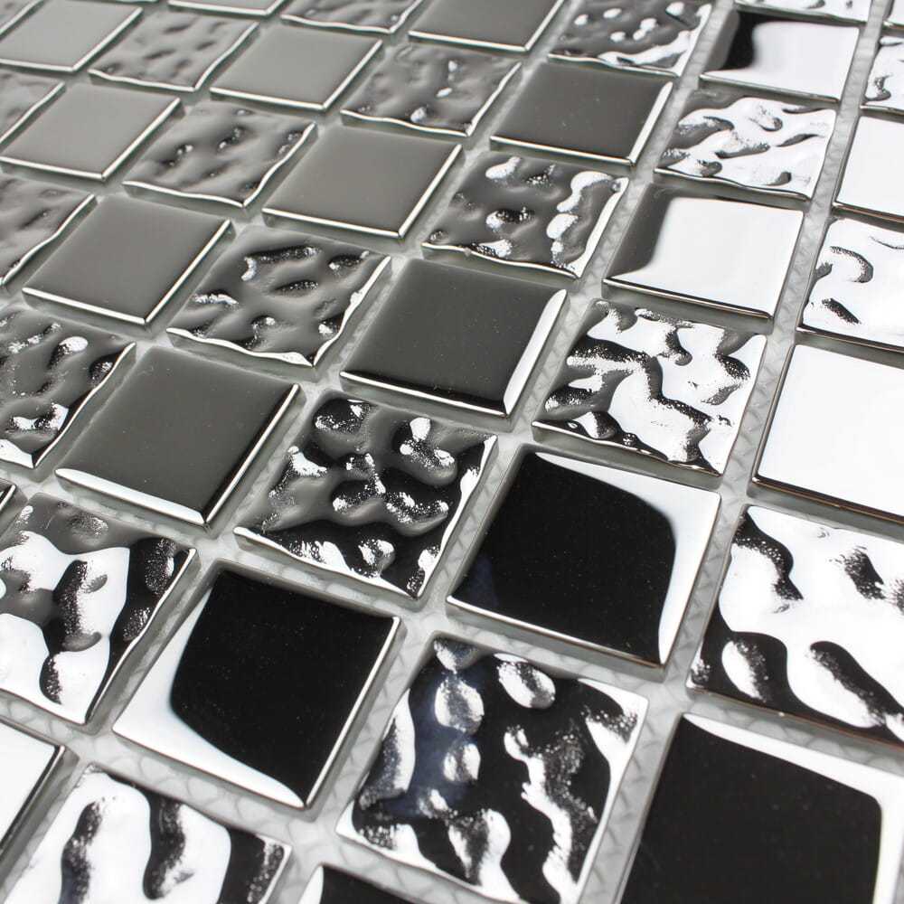 Prezentowana srebrna - lustrzana mozaika o naprzemiennych kostkach gładka kostka / falowana kostka, marki EXCLUSIVE DESIGN to wyrób ręcznie wykonany. Każda pojedyncza kostka mozaiki zostaje sprawdzona, po czym umieszczana na siatce transportowej ręcznie. Dzięki siatce transportowej, sam montaż tafli mozaiki jest o wiele szybszy i łatwiejszy - przec co mniej kosztowny.