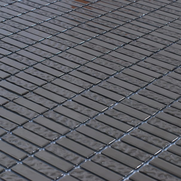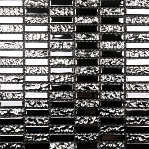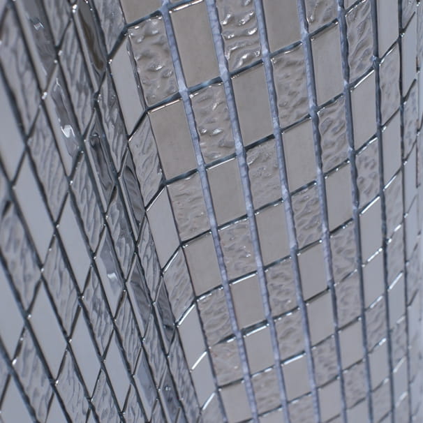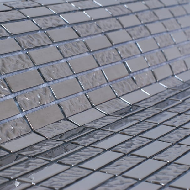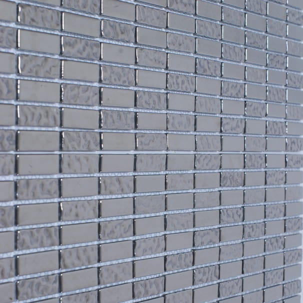 Srebrna mozaika o naprzemiennych podłużnych kostkach.