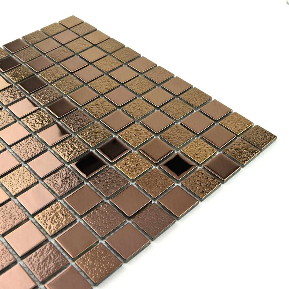 Mozaika różowe złoto - kolor marki EXCLUSIVE DESIGN to wyrób ręcznie wykonany. Każda pojedyncza kostka mozaiki zostaje sprawdzona, po czym umieszczana na siatce transportowej ręcznie. Dzięki siatce transportowej, sam montaż tafli mozaiki jest o wiele szybszy i łatwiejszy - przec co mniej kosztowny.